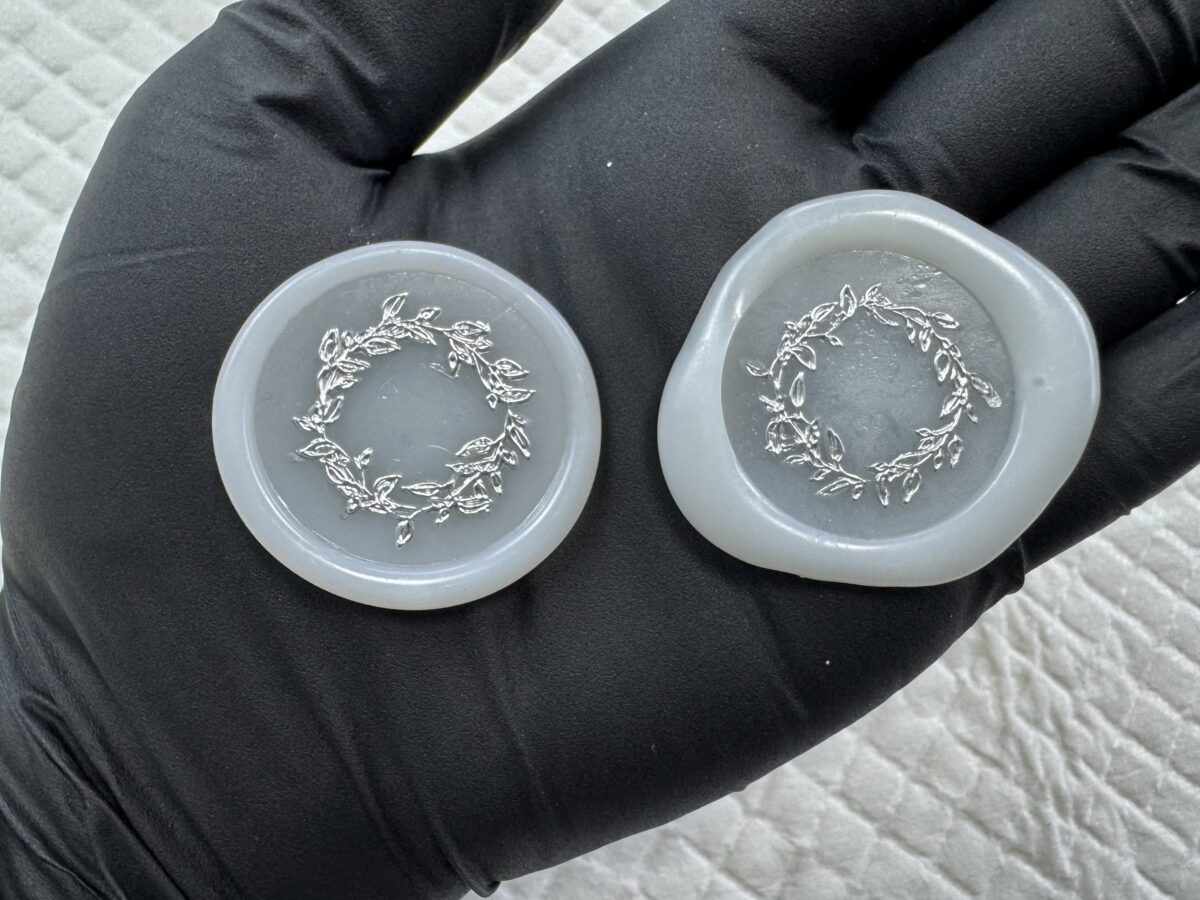 対策:適切な温度でグルーを扱う/スタンプより一回り程小さい量のグルーを出す/シリコンモールドを使うと、安定した丸い形にしやすいです。